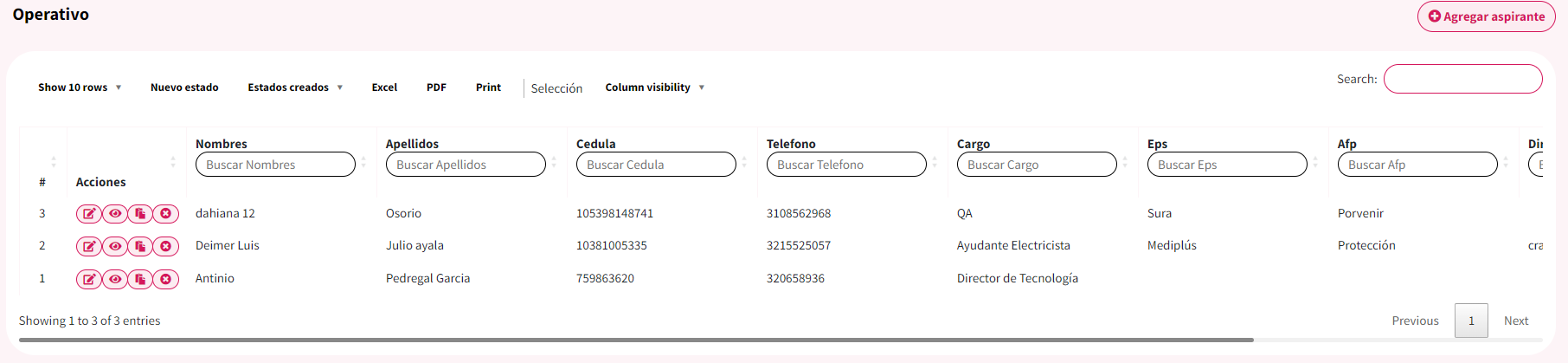 En la parte superior de la siguiente vista podrás agregar un nuevo aspirante haciendo clic en el botón “+Agregar aspirante”.